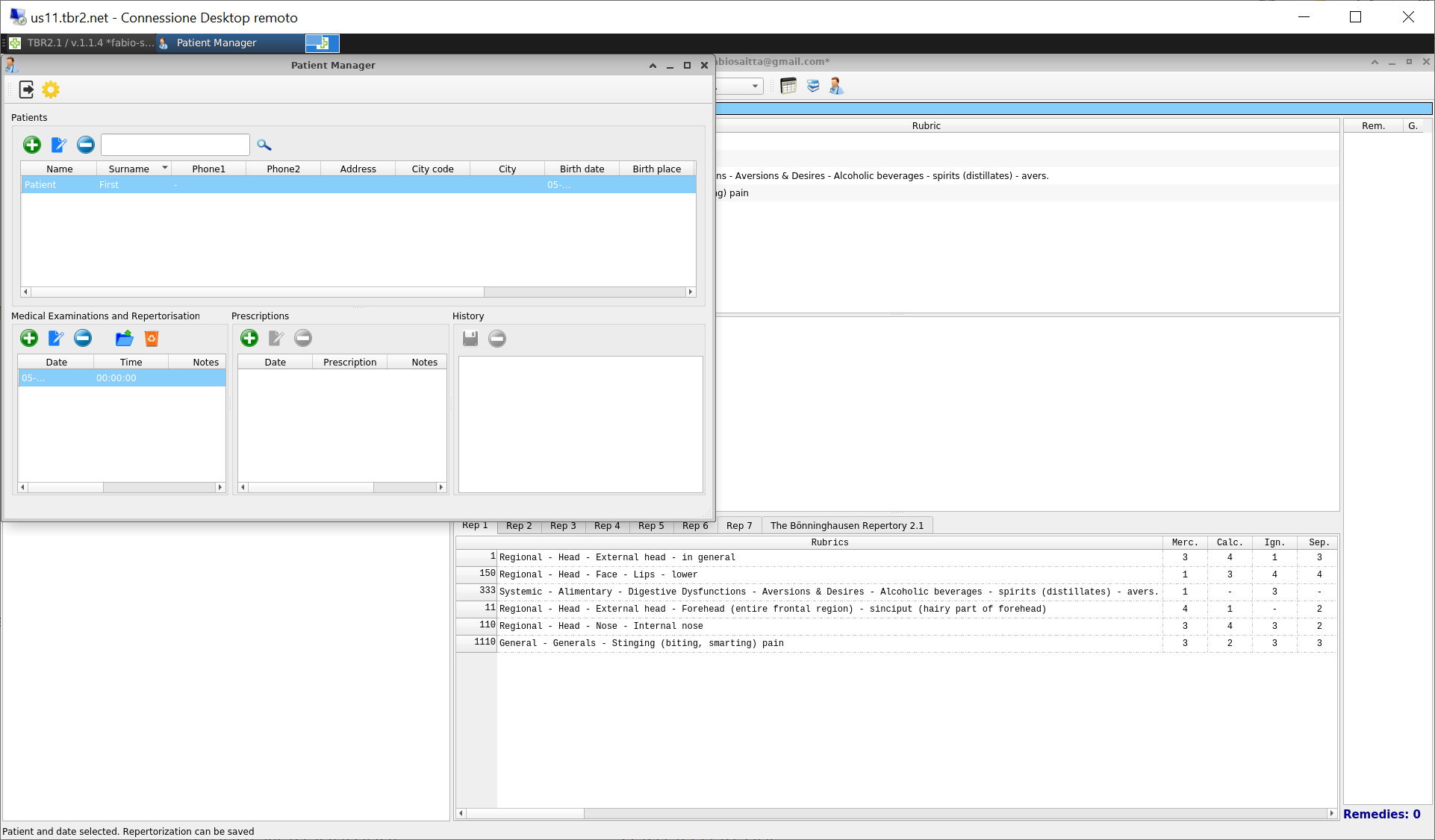 Patient management with personal data, visits and remedies considered.